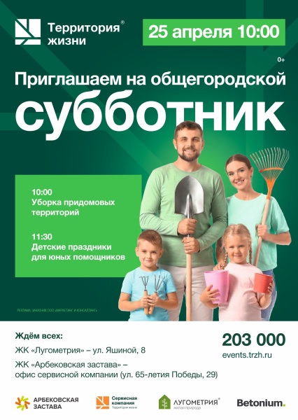 Уважаемые жители жилых комплексов «Арбековская застава» и «Лугометрия»! По доброй традиции коллектив ГК «Территория жизни» благоустраивает микрорайон в День общегородского субботника, приводит в порядок строительные и производственные площадки.