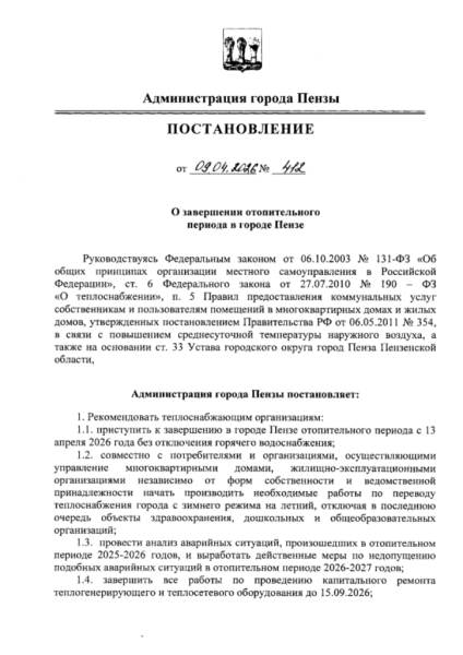 Согласно распоряжению Администрации г. Пензы № 412 от 9 апреля 2026 года, в плановом режиме производится отключение отопления с 13 апреля.